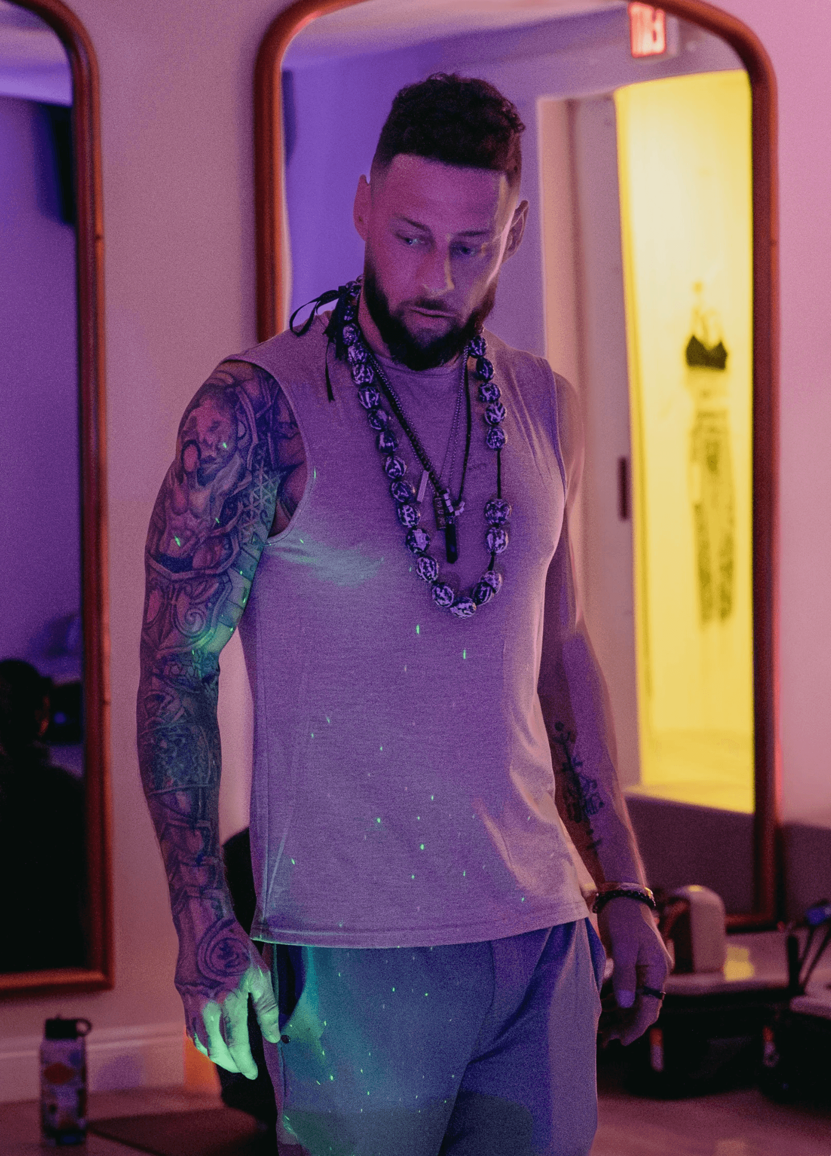 5 AM breathwork and beach brotherhood training before breakfast. Firearms precision at Firing-Line Range, then UWD Modules 2–6 at the property. Afternoon combat with Razor Rob, evening cacao/rapé ceremony and beach fire to process the day.